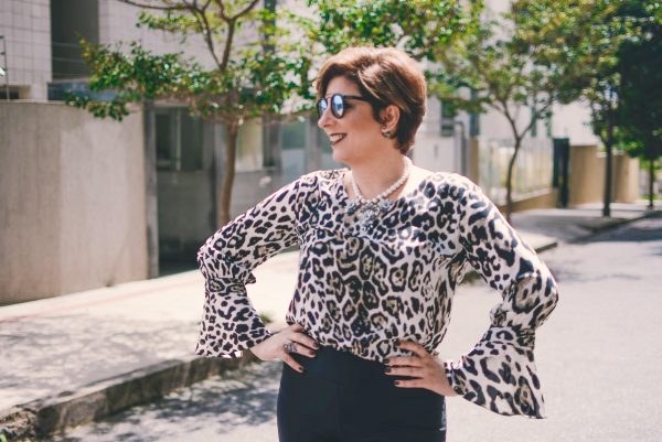 O look do dia composto por blusa de seda animal print e casado de lã bicolor é perfeito para essa situação. A combinação faz o estilo hi-lo de peça em tecido leve como a seda mais o tecido pesado que é essa lã. A manga da camisa num estilo boca de sino é super jovial.