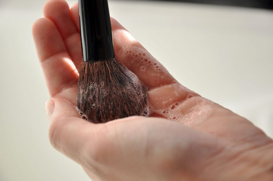 – Pinceis de cerdas diversos: As cerdas dos pinceis são presas ao cabo por pressão e cola, por isso estes devem ser lavados com muito cuidado para não soltarem. Lave-os após cada utilização. Coloque um pouco de detergente e umas gotas de água sanitária em uma vasilha com água morna (não pode ser muito quente). Mergulhe os pinceis e deixe-os de molho por uns 5 minutos. Depois esfregue as cerdas com a ponta dos dedos ou em dispositivos de silicone próprios. Se necessário, aplique um pouco de detergente nas cerdas, retirando todo resíduo de maquiagem. Depois de limpos, enxague-os em água fria. Borrife o limpador de pincéis e esfregue novamente no silicone, enxágue. Pressione os pelos, retirando o excesso de água. Deixe-os secar sobre uma toalha limpa.