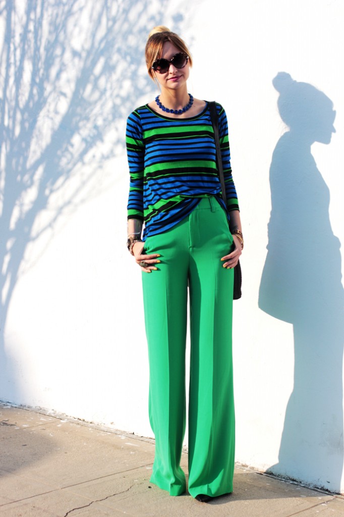 Pode ser combinado com uma grande variedade de cores, inclusive com sua complementar, o vermelho, permitindo ao look contraste total. Porém, é necessário bom gosto e bom senso para se fazer uma combinação equilibrada.