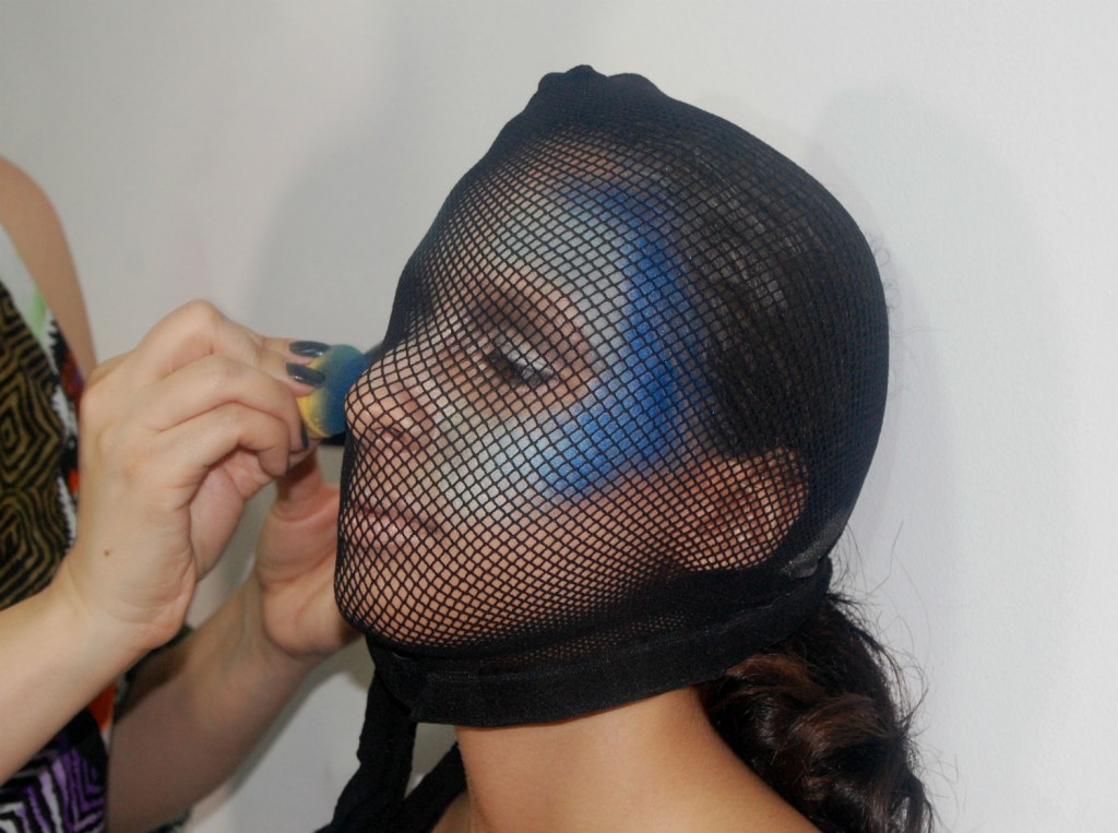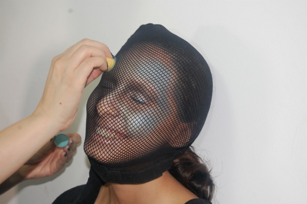 Para finalizar a parte do rosto da sereia, apliquei gliter furtacor nas laterais das têmporas com gel de fazer delineador (produto Mac Pro). Finalizado o rosto, retirei a meia com cuidado para não arrastá-la sobre a pele.