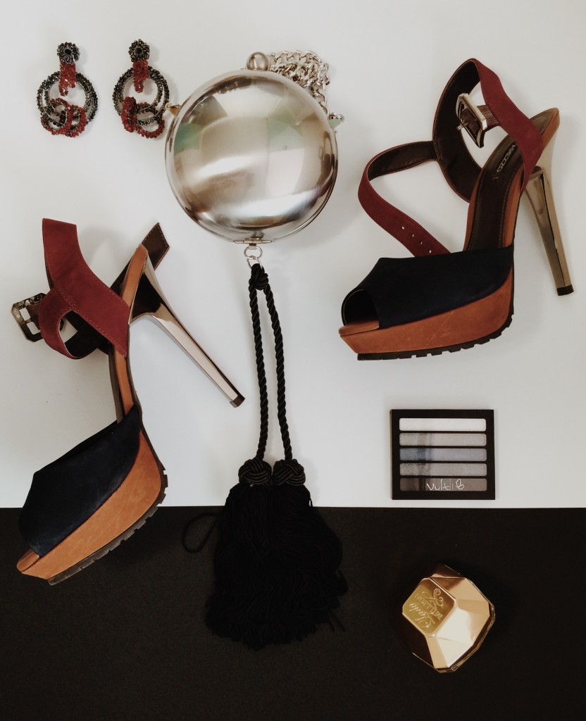 Escolhi um jump suit vinho com mangas longas, todo fechado, mas com corte e tecido que revelam as curvas de forma muito elegante. O modelo tem um drapeado no abdome que disfarça a barriga, pernas tipo pantalona e decore V, que alonga ainda mais meu tronco (curto do tipo triangular invertido). Para arrematar o look usei poucos acessórios, porém marcantes. A bolsa esfera metalizada deu luz e um toque de glamour o look. Os brincos em croché de metal complementaram a produção com brilho e originalidade.