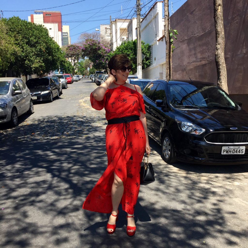 O red dress Lume tem decote ombro a ombro e uma fenda profunda, mas transpassada de forma a não se abrir completamente ao caminhar. Mas, quando se senta a fenda se revela. Para completar o look do dia, usei sandálias vermelhas em plataformas, um cinto tipo obi e bolsa preta com correntes em material sintético.