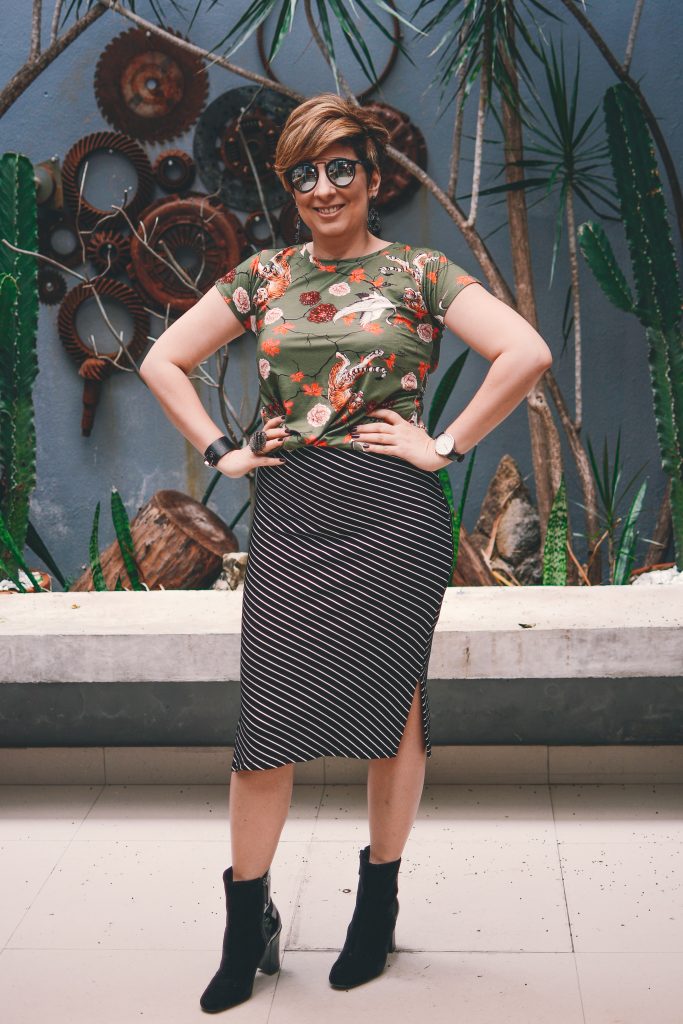 Pois bem, essa parka com estampa que remete (de longe, muito longe hehehe) o camuflado típico dos exércitos é confeccionada numa sarja mais leve e tem a possibilidade de se controlar o franzido da cintura, deixando a peça mais ou menos acinturada. Amei isso. A cor é linda e a estampa é maravilhosa. Foi amor à primeira vista. Para compor o look usei o twin set da parka militar, pois os conjuntinhos são forte tendência do próximo inverno e fáceis de combinar e usar. Como não sou nada básica combinei o conjunto com uma saia listrada e fiz logo um mix de estampa radical. Para completar a produção, usei velvet boots estilo retrô, mas que lembram coturnos e bolsa básica.