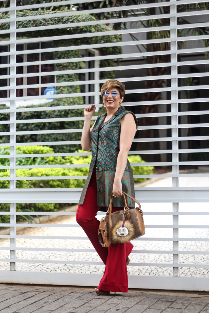 Composto apenas por calça flare e um maxi colete em jacquard, o look tinha contraste de cores – que amo e mix de estampas entre a bolsa e o colete. A calça flare tem a essência das verdadeiras calças bocas de sino dos anos 70. Com a boca bem larga e um tecido de ótimo caimento, a calça bailava a cada passo que eu dava. Todo esse movimento deixa a imagem sensual e aberta. Em contraponto, o maxi colete com seu tecido rígido e estampa sóbria, impôs respeito e força. O look tem a minha cara, por isso faz parte do meu acervo, como todos os outros. rs