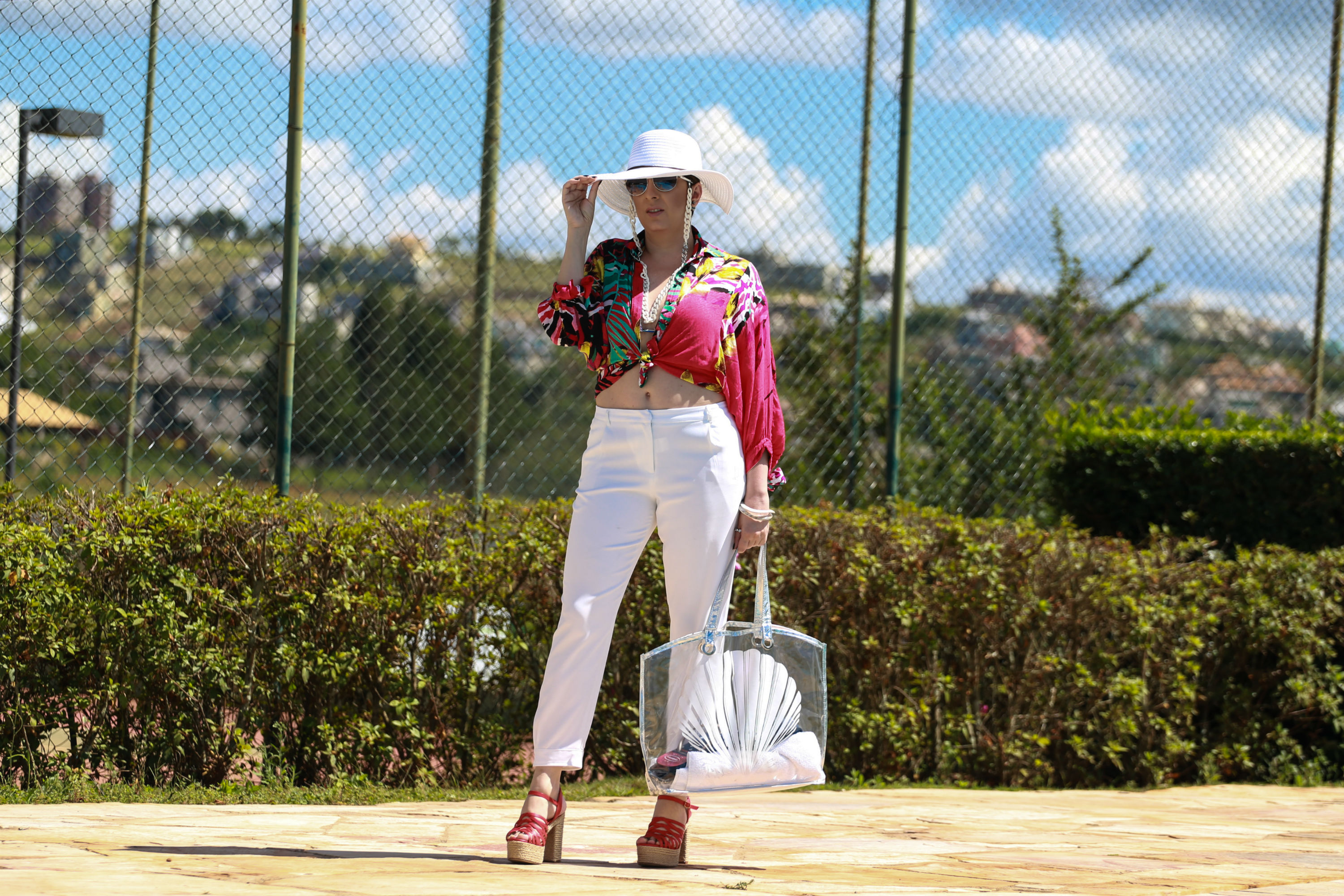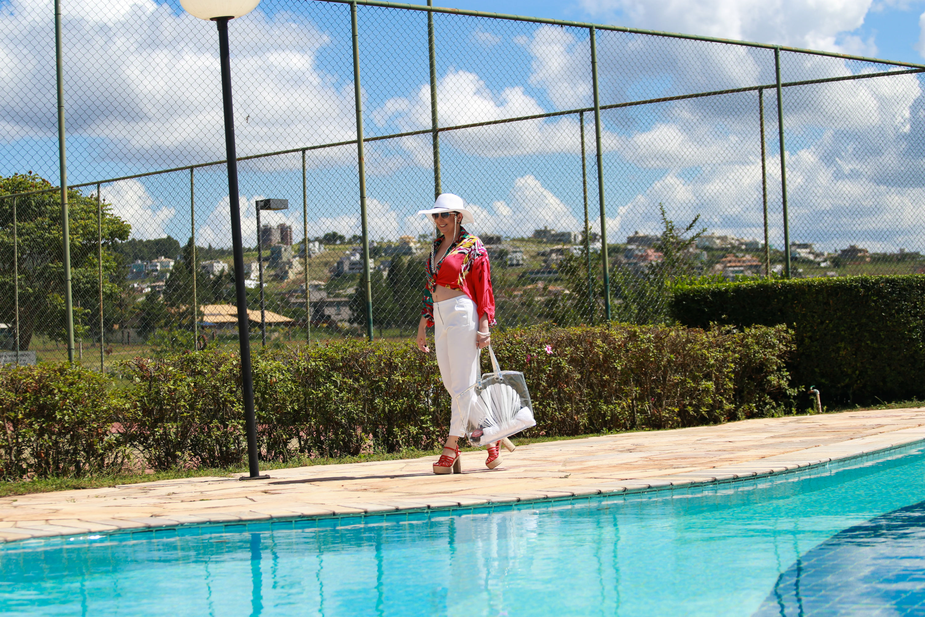 Composto por calça pijama e camisa de viscose bem colorida, arrematado por uma sacola em plástico (também Shoulder, presente do verão atual) e sandália com solado em corda. A blusa amarrada aparecendo o biquini deu um charme a mais e a cara de look piscina. Dentro da sacola, itens indispensáveis para uma pool party: toalha, Havaianas, filtro solar. O chapéu é outro item que não poderia faltar, concordam?