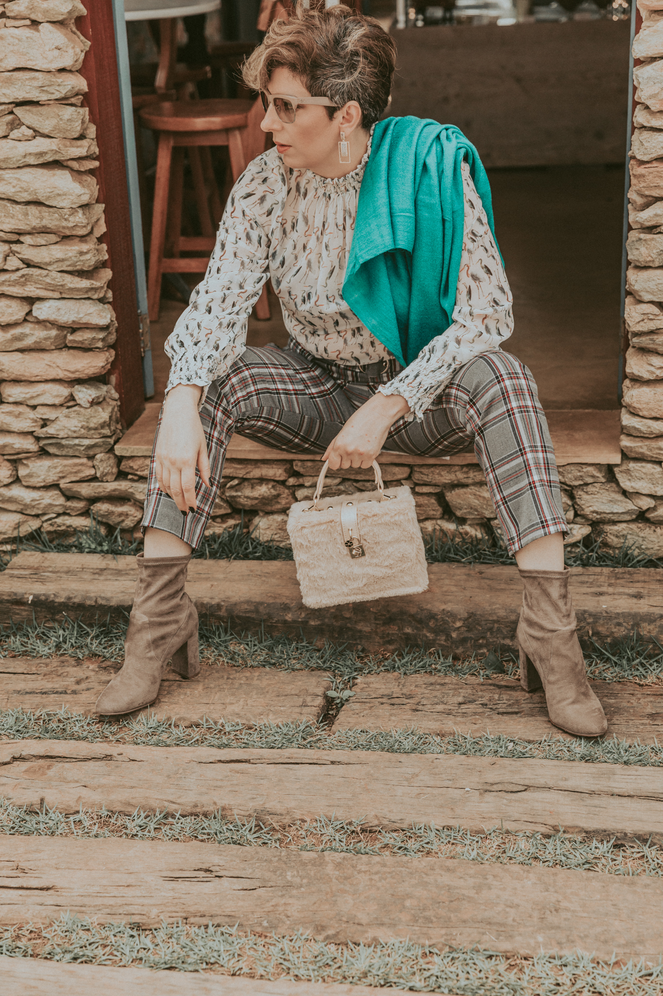 Para esse look usei um mix de estampa delicado, trazendo modernidade e feminilidade ao corte alfaiataria. A calça em lãzinha xadrez príncipe de gales apresenta uma alfaiataria revisatada, pois tem cós alto dando referência à calça clochard. A camisa com estampa de pássaros confere bastante leveza e um toque de lúdico ao look. Os detalhes em latex na gola e punhos é outra tendência desse inverno que remete à era vitoriana. Para arrematar o look, botas meia em camurça e echarpe em lã numa cor alegre e forte para dar um toque de contraste.