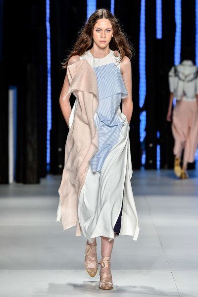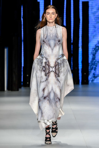 A cartela de cores é calma, mas não insonsa. O blush, rosa seco, foi explorado em tecidos brilhantes em looks monocromáticos ou combinado com cores fortes como o azul marinho. Com estamparia exclusiva, ele trouxe imagens que lembram o universo e técnica de marmorização em tecido, muito chique. Seu shape traz a simplicidade do minimalismo, mas mostra sua força. Os tecidos são de caimento impecável permitem brincar com a costura de forma bem criativa, leve e solta, mantendo a mulher feminina e elegante.