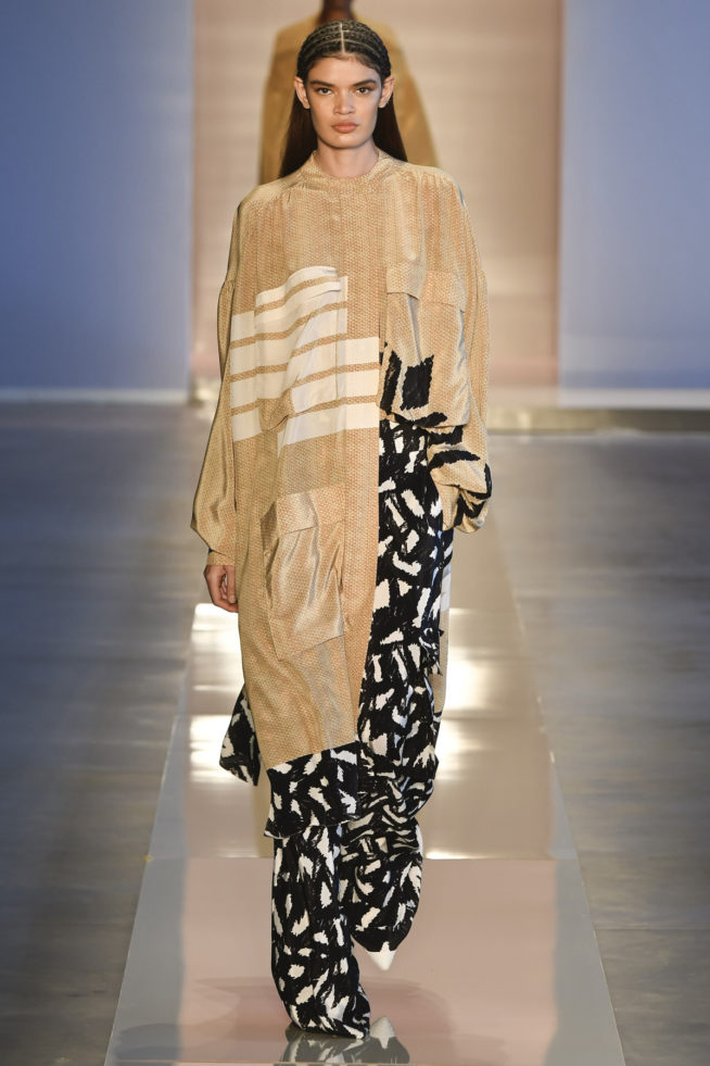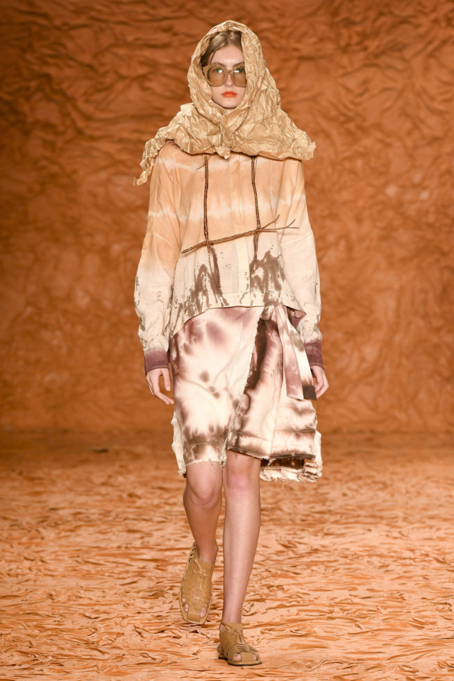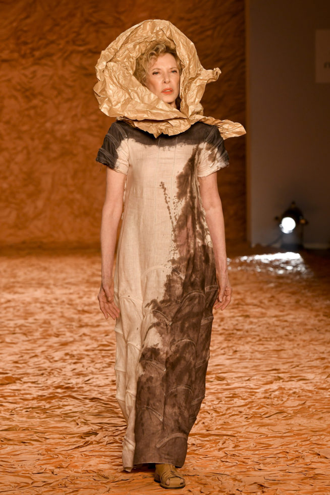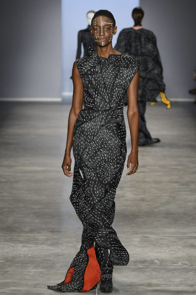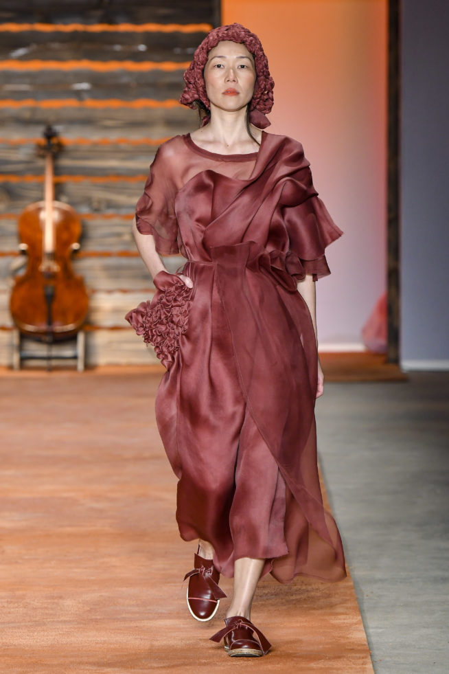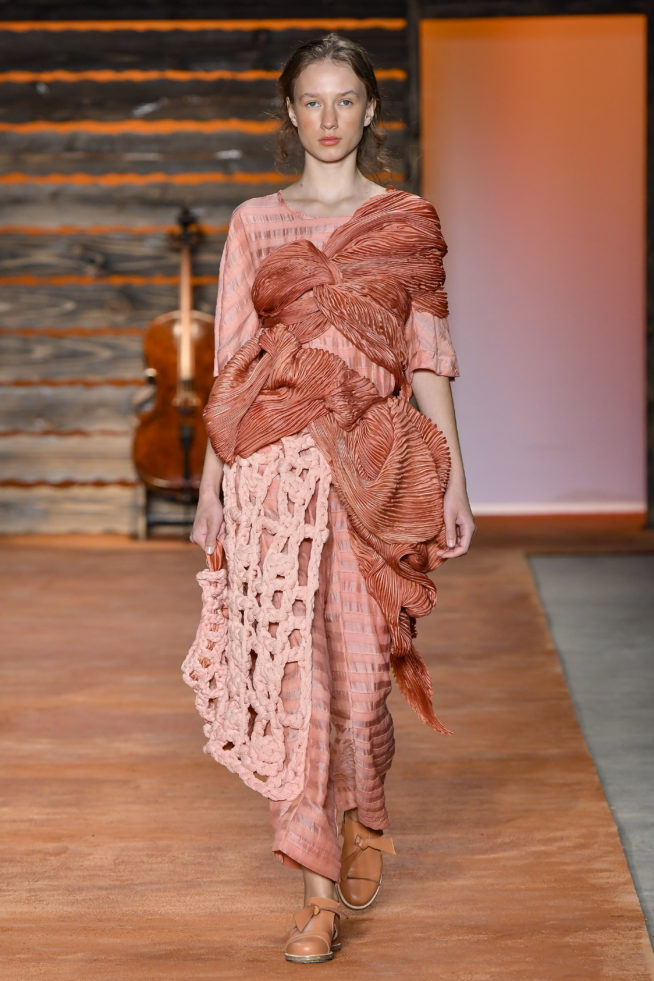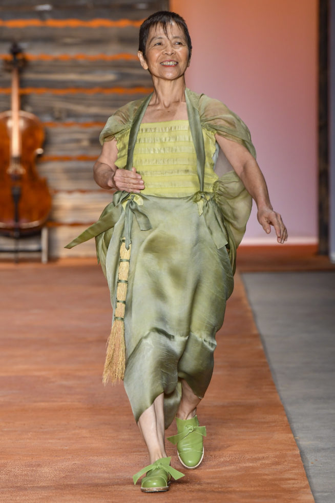 - Fernanda Yamamoto trouxe uma homenagem à sustentabilidade. Com um desfile cheio de entrelaçados de seda inspirados na comunidade Yuda, formada por japoneses. A comunidade fica a 600 km de São Paulo e tem como valores o respeito à natureza, o zero desperdício, o convívio humano. As peças são monocromáticas. Os tecidos sofreram tingimento artesanal/natural. O corte costura foram pensados de forma a reduzir resíduos têxteis. Lembra muito a técnica moulage e o plissado de Issey Miyake. O casting também preservou a diversidade, com pessoas comuns além das modelos.