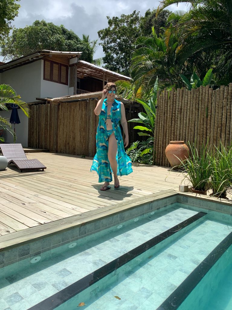 O primeiro look é composto por biquini e saída no estilo chemise. Esse modelo de vestido é um coringa no guarda roupa, pois é atemporal e clássico. Valoriza todo tipo de silhueta e tem um ar arrumadinho. A estampa em tons de turquesa é iluminada e super jovial. O biquini tem o corte meio “asa delta” e o top tem um babado bem feminino que valoriza o colo.