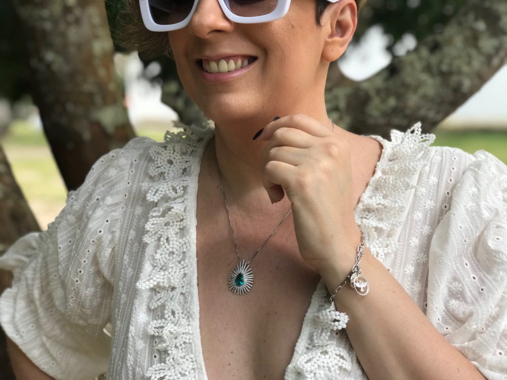 O segundo look é o vestido em laise branco. O tecido é uma das fortes tendências do verão. (Já falei sobre a laise aqui, mas farei outro artigo com os modelos da estação). O corte super feminino valoriza a cintura. O caimento e babados conferem movimento à imagem com uma leve transparência. Me senti uma princesa nesse look. hehehe O vento atrapalhou um pouco a tentativa de registrar o look na praça do Quadrado, com o mar ao fundo. rsrs