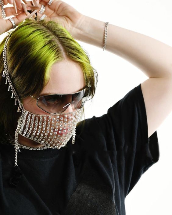 Suas roupas largas quase a escondem, engolindo suas formas. Mas são cheias de significado subliminares como a máscara que ela usou no tapete vermelho do Grammy 2020. E olha que o coronavírus ainda nem era pandemia.