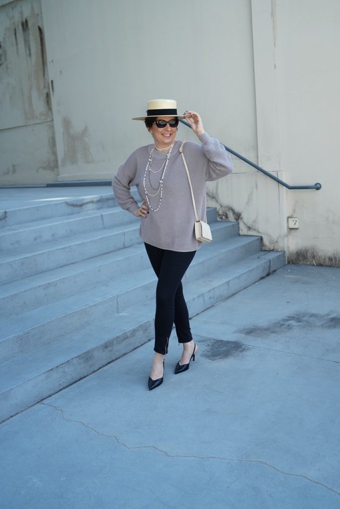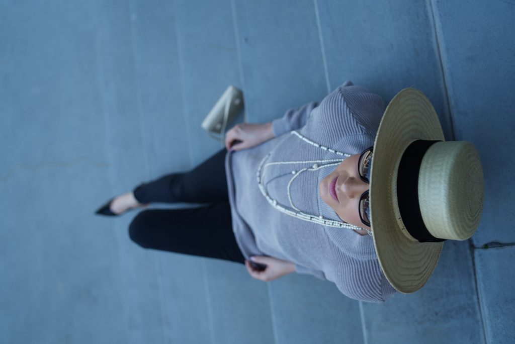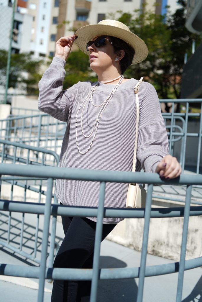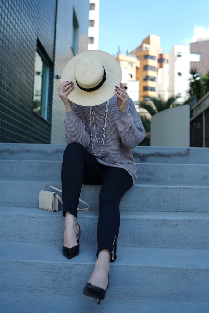 O maxi tricô Dzarm que veio na minha Upperbag é levinho, com ótimo caimento e uma textura muito interessante. É daqueles tricôs que aquecem na medida, sabem? Combinei com a calça cigarrete preta e sapato chanel. Para arrematar, usei óculos e chapéu por causa do sol a pino.