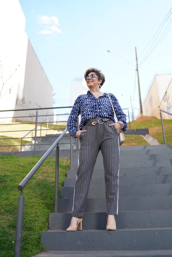 Para esse look do dia feito para a Upperbag (já usaram meu cupom?: ALEFARIA30) usei um mix ousado. Pois, as estampas não tinham cores em comum. Ou quase, uma vez que a calça tinha uma listra lateral branca e a risca de giz também branca. É um detalhe super delicado, mas que criou a “conversa” entre as duas estampas. Além disso, o azul e o cinza são cores muito próximas, criando uma boa harmonia.