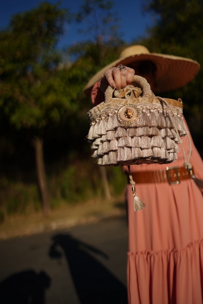 A modelagem do vestido é aquela soltinha de cintura mais alta, estilo anos 90 que falei por aqui e que é tendência atual. Para completar o look usei sandálias em tom terroso. A bolsa de palha e franja é a cara da primavera verão 2021. Ela tem seu design diferenciado que deixa qualquer look lindo. Para finalizar um maxi chapéu para proteger do sol de fim de tarde. O resultado, vocês conferem a seguir.