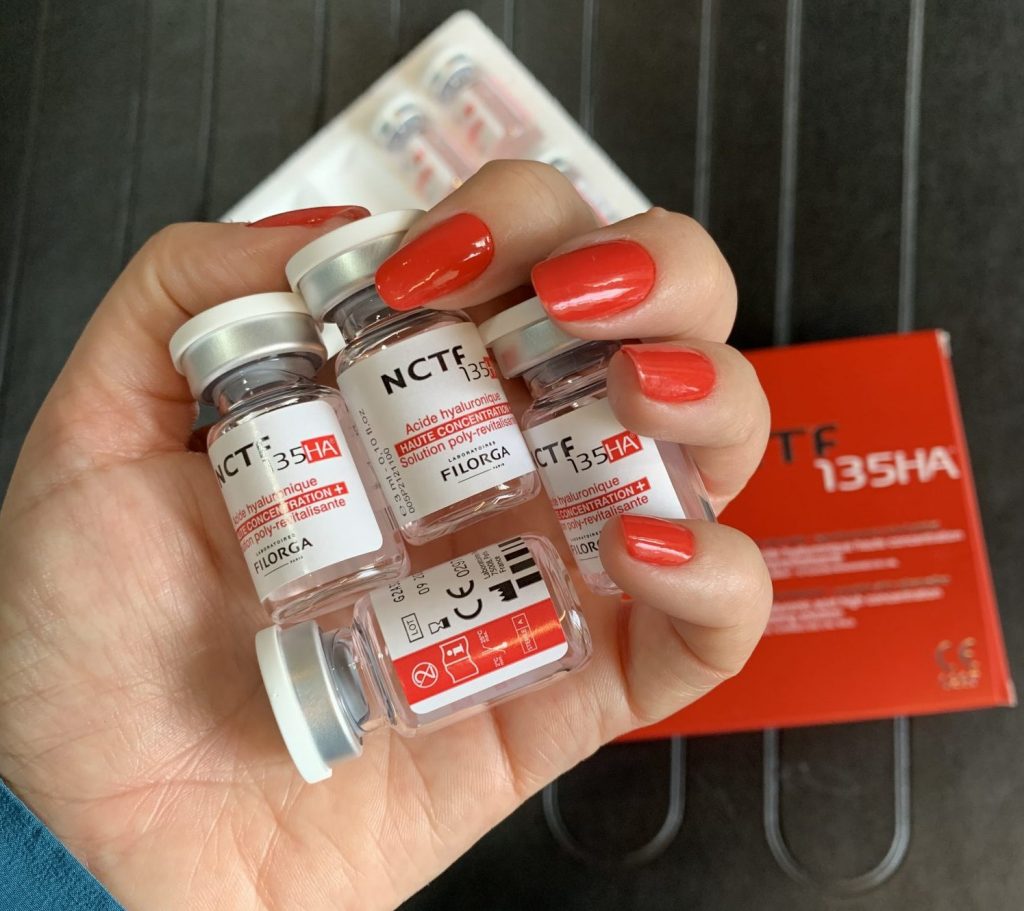 Na Clínica TM do meu biomédito Thiago Martins, uso o melhor produto do mercado no que tange o skinbooster: o NCTF. Inclusive já falei sobre ele aqui, em resenha. O produto é completo para terapia antienvelhecimento intraderme e revitalização profunda. É indicado principalmente para peles maduras. É um complexo policondicionador composto de ácido hialurônico não reticulado que contém mais de 55 ativos em sua composição. Destacam-se dentre eles: 13 vitaminas, 6 minerais, 5 ácidos nucleicos, 2 agentes redutores, 6 coenzimas e 23 aminoácidos. Não é pouca coisa.