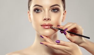 Makeup,Artist,Applies,Pink,Gloss,Lipstick,.,Beautiful,Woman,Face.