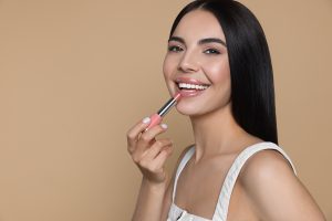 Beautiful young woman applying nude lipstick on beige background